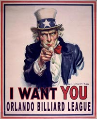 The Orlando Billiard League is a Wednesday night 8-ball league. Teams consist of five to eight players, with 5 players from each team playing in a match. Matches generally last about 3 hours.